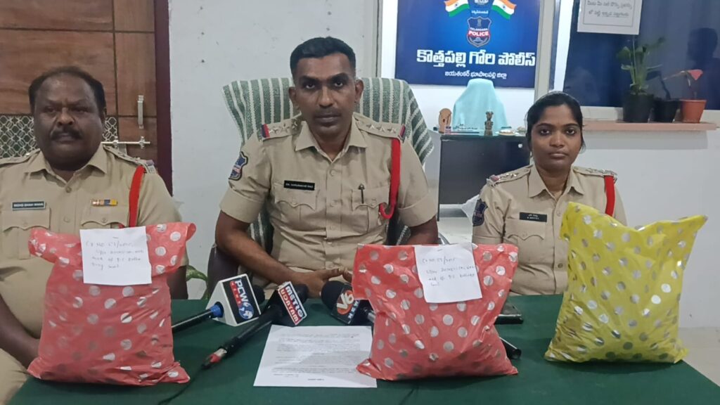 జయశంకర్ భూపాలపల్లి జిల్లా కొత్తపల్లి గోరి మండలంలో మాదకద్రవ్యాల అక్రమ రవాణా,విక్రయాలపై పోలీసులు దాడి నిర్వహించి ముగ్గురు అంతర్రాష్ట్ర నిందితులను కొత్తపల్లి గోరి ఎస్సై సాకపురం దివ్యా అరెస్టు చేశారు.ఈ దాడి వివరాలను గణపురం సర్కిల్ సీఐ కరుణాకర్ రావు కొత్తపల్లి గోరి పోలీస్ స్టేషన్లో నిర్వహించిన విలేకరుల సమావేశంలో వెల్లడించారు.సీఐ కరుణాకర్ రావు కొత్తపల్లి కె గ్రామ శివారులోని కెనాల్ వద్ద గంజాయి విక్రయం జరుగుతున్నట్టు అందిన విశ్వసనీయ సమాచారం మేరకు ఎస్సై దివ్య ఆధ్వర్యంలో ప్రత్యేక బృందం ఏర్పాటు చేసినట్టు తెలిపారు.పంచులు, రెండు ప్రభుత్వ వాహనాలు, డిజిటల్ వెయర్, ఫోటోగ్రాఫర్ సహకారంతో శ్రీమాత రైస్ మిల్–గాంధీనగర్ రోడ్డు మీద సీక్రెట్ ఆపరేషన్ చేపట్టినట్టు వివరించారు.పోలీసులను చూసి పరారయ్యే ప్రయత్నం చేసిన ముగ్గురు అనుమానితులను వెంటనే అదుపులోకి తీసుకొని,వారి వద్ద జరిగిన తనిఖీలో 2.3 కిలోల ఎండు గంజాయి,53 గంజాయి చాక్లెట్లు,3 మొబైల్ ఫోన్లు స్వాధీనం చేసుకున్నట్టు తెలిపారు.అరెస్టయిన నిందితులు 1.చోట కుమార్ వయసు 20 సంవత్సరాలు, హమాలీ, కర్ణభూష గ్రామం, కగారియ జిల్లా, బీహార్