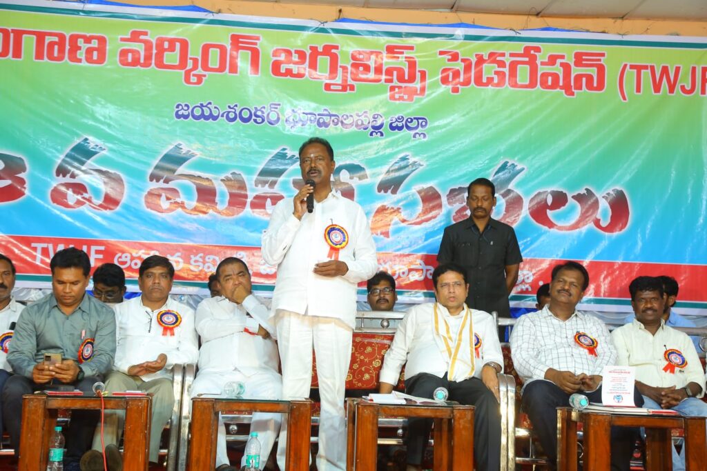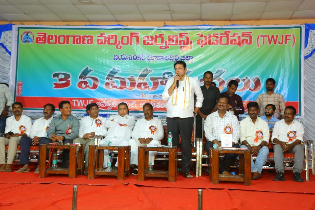 రాష్ట్రంలోని జర్నలిస్టుల సంక్షేమానికి ప్రభుత్వం వెనుకాడబోదని జర్నలిస్టుల ఇండ్ల ,హెల్త్ కార్డుల,అక్రిడియేషన్,సమస్యలపై నెలకొన్న సాంకేతిక సమస్యలను పరిష్కరించేందుకు కృషి చేస్తామని రాష్ట్ర ఐటీశాఖ మంత్రి దుద్దిల్ల శ్రీధర్ బాబు వెల్లడించారు.బుధవారం భూపాలపల్లి మంజూరునగర్ లోని ఇల్లందు క్లబ్ లో తెలంగాణ వర్కింగ్ జర్నలిస్ట్ ఫెడరేషన్(టీడబ్ల్యూజేఎఫ్) 3వ మహాసభ సీనియర్ జర్నలిస్టు,టీడబ్ల్యూజేఎఫ్ జిల్లా నాయకులు ఎర్రం సతీష్ కుమార్ అధ్యక్షతన జరిగింది.ఈ సమావేశానికి ముఖ్య అతిథిగా రాష్ట్ర ఐటీ,ఎలక్ట్రానిక్స్,కమ్యూనికేషన్స్, పరిశ్రమలు,శాసనసభ వ్యవహారాల శాఖ మంత్రి దుద్దిళ్ల శ్రీధర్ బాబు, భూపాలపల్లి ఎమ్మెల్యే గండ్ర సత్యనారాయణ రావు హాజరయ్యారు.ఈ సందర్భంగా మంత్రి మాట్లాడుతూ జర్నలిజం సమాజంలో గౌరవప్రదమైన వృత్తి అని,ప్రజాస్వామానికి నాలుగో స్తంభంగా జర్నలిజం పిలువ పడుతుందని అన్నారు.స్వాతంత్ర పోరాటంలో గాంధీ లాంటివారు పత్రికలు స్థాపించి జర్నలిజం ద్వారా ప్రజలలో మార్పు తీసుకువచ్చారని,అలాంటి ప్రతిష్టాత్మకమైన వృత్తిలో జర్నలిజం సమాజాన్ని మేలుకొలపాలని పిలుపునిచ్చారు.ప్రస్తుతం సోషల్ మీడియా యుగం నడుస్తుందని, జర్నలిస్టులు టెక్నాలజీని ఒక విప్లవమైన శక్తిగా మార్చాలని ఆలోచనతో ఉన్నప్పటికీ పెన్ను విలువ ఎప్పటికీ తగ్గదని వెల్లడించారు.అసలు సిసలైన వార్తలు రాసి జర్నలిస్టులు సమాజం లోని రుగ్మతలను రూపుమాపాలని, ప్రభుత్వాలకు మార్గదర్శకంగా నిలవాలని పిలుపునిచ్చారు. జర్నలిస్టులు పరిశోధనాత్మక వార్తలు రాసి శాస్త్రీయమైన సాంకేతికని జోడించి ప్రజలకు మేలు చేకూర్చేలా చూడాలని సూచించారు.జర్నలిస్టుల సమస్యలపై త్వరలోనే ఒక పరిష్కారం కనుగొనే దిశగా ప్రభుత్వ ముందుకు సాగుతుందని స్పష్టం చేశారు.జర్నలిస్టులకు ఇళ్ల స్థలాల కేటాయింపు పై సాంకేతిక సమస్యలు ఉన్నప్పటికీ వాటిని ఎలా అధిగమించాలని విషయంపై ప్రభుత్వం చర్యలు తీసుకుంటుందని స్పష్టం చేశారు. జర్నలిస్టుల ఆరోగ్య భద్రత ప్రభుత్వం దృష్టి సారించిందని చాలామంది జర్నలిస్టులకు ఆరోగ్యపైన సమస్యలు ఉత్పన్నమవుతున్నాయని అన్నారు.కొంతమంది సొంత కథనాలు రాయలేదని మీడియాపై అక్కసును ఖండిస్తున్నానని వెల్లడించారు.భూపాలపల్లి ఎమ్మెల్యే గండ్ర సత్యనారాయణ రావు మాట్లాడుతూ.. జర్నలిస్టుల సమస్యల పరిష్కారానికి కృషి చేస్తానని,జిల్లా కేంద్రంలో ప్రెస్ క్లబ్ భవనానికి అవసరమైన నిధులను కేటాయిస్తానని హామీ ఇచ్చారు. భూపాలపల్లి జిల్లాలో జర్నలిస్టు లకు అవసరమైన ఇండ్ల స్థలాల కేటాయింపుపై ముఖ్యమంత్రి, సంబంధిత శాఖ మంత్రి తో చర్చించి త్వరలోనే నిర్ణయం తీసుకుంటామన్నారు.జర్నలిస్టులు సమాచారం సేకరించడంలో,నివేదించడంలో,న్యాయంగ