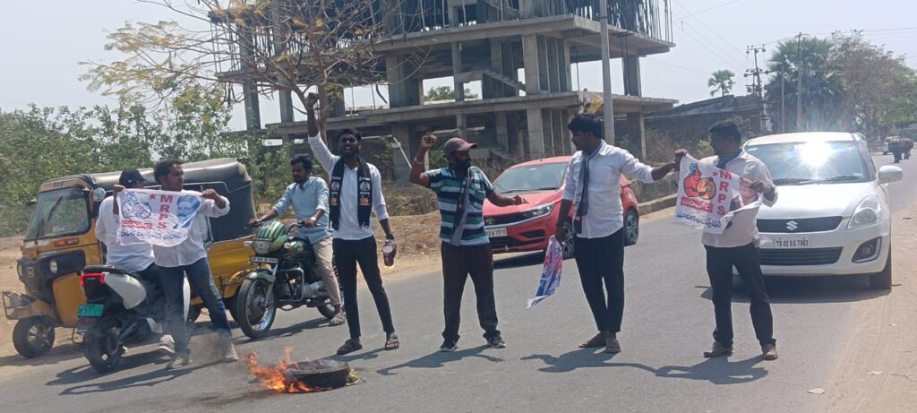 సోంపెల్లి అన్వేష్ మాదిగ MRPS మండల అధ్యక్షులు ఆధ్వర్యంలో సీఎం రేవంత్ రెడ్డి ఎస్సి వర్గీకరణ అమలు చేయకుండా ఉద్యోగ నియామకాలు, ఫలితలను విడుదల చేయుటను నిరసిస్తూ ధర్మసాగర్ మండల కేంద్రంలోని పెట్రోల్ బంకు సమీపంలో మెయిన్ రోడ్డు వద్దసీఎం రేవంత్ రెడ్డి మరియు ప్రభుత్వనికి వ్యతిరేకంగా టైర్ తగల బెట్టి నిరసన తెలియచేయడం జరిగినది ఈ కార్యక్రమంలో పాల్గొన్నావారు చిలుక రాజుమాదిగ MRPS మండల ప్రధాన కార్యదర్శి, కొట్టె కళ్యాణ్ మాదిగ మండల నాయకులు, నక్క రమేష్ మాదిగ మండల నాయకులు, పుట్ట ప్రశాంత్ మాదిగ MRPS జిల్లా నాయకులు తదితరులు పాల్గొన్నారు,